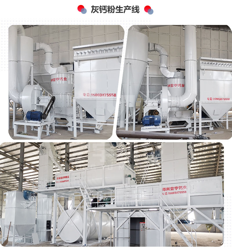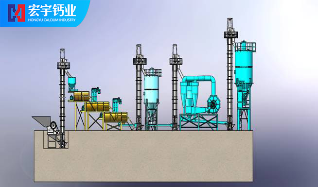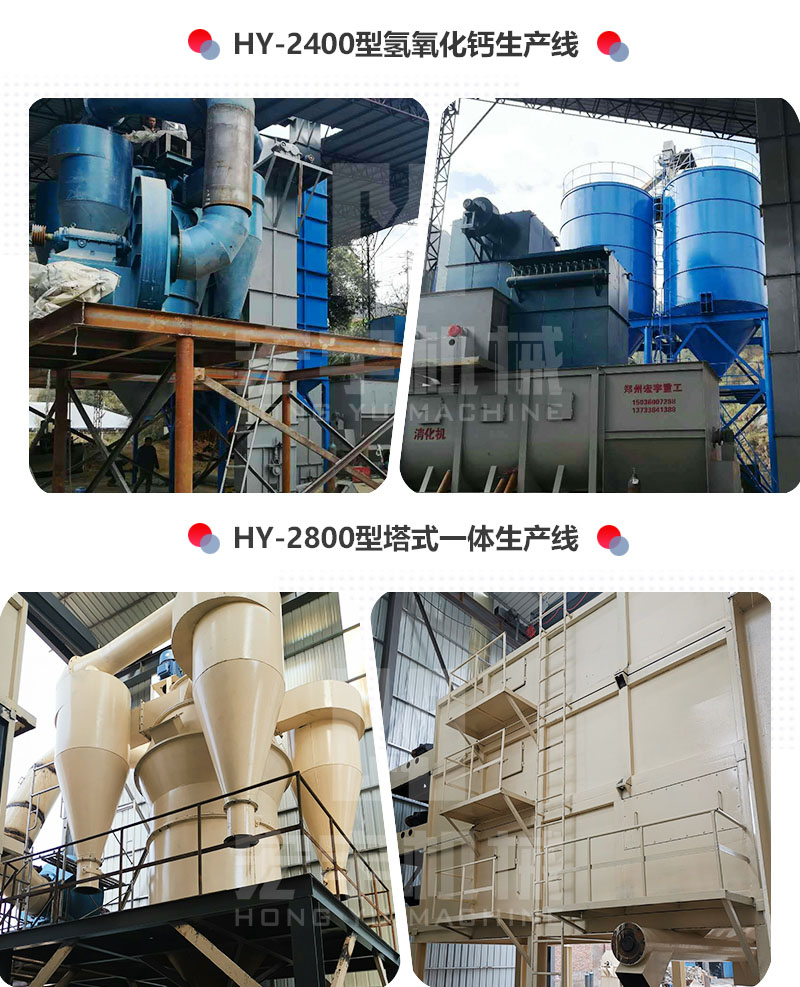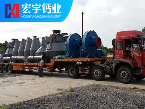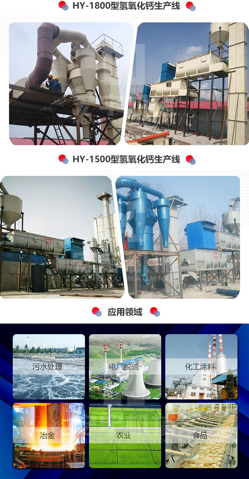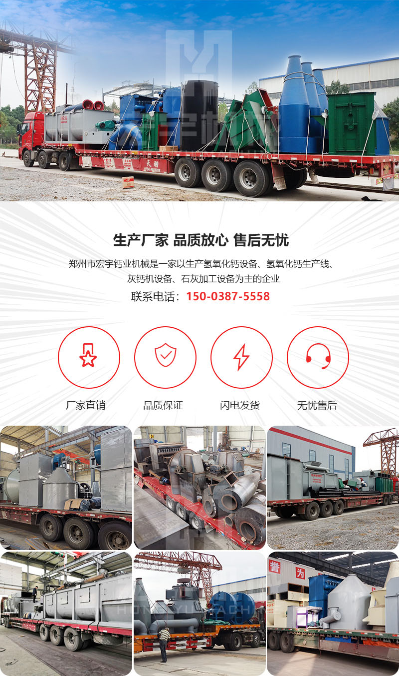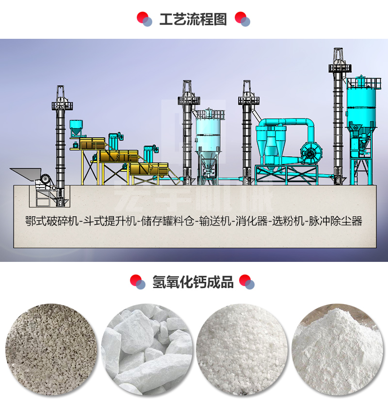 將合格的氧化鈣(CaO)塊料由鄂式破碎機(jī)破碎至40mm左右粒度,經(jīng)斗式提升機(jī)送入氧化鈣儲(chǔ)存罐料倉,料倉中的氧化鈣經(jīng)穩(wěn)流輸送機(jī)定量穩(wěn)重系統(tǒng)進(jìn)入氫氧化鈣Ⅰ級(jí)消化器進(jìn)行初步消化,當(dāng)氫氧化鈣完成初級(jí)消化以后進(jìn)入Ⅱ級(jí)消化或Ⅲ級(jí)消化器,使氧化鈣消化分解,生成合格的氫氧化鈣初級(jí)產(chǎn)品,消化率達(dá)到98%,(消化系統(tǒng)根據(jù)產(chǎn)能要求,機(jī)型設(shè)計(jì)分為單軸、雙軸及多軸機(jī)型)。消化分解好的氫氧化鈣再由半成品螺旋輸送機(jī)送入選粉機(jī)內(nèi),由選粉機(jī)完成產(chǎn)品雜質(zhì)分離和細(xì)度分級(jí),完成分級(jí)后的終端合格產(chǎn)品,由成品輸送機(jī)、提升機(jī)卸入成品氫氧化鈣罐倉進(jìn)行分別包裝。本套生產(chǎn)線所有污染節(jié)點(diǎn)由脈沖除塵器完成,收塵率達(dá)到99.5%。
